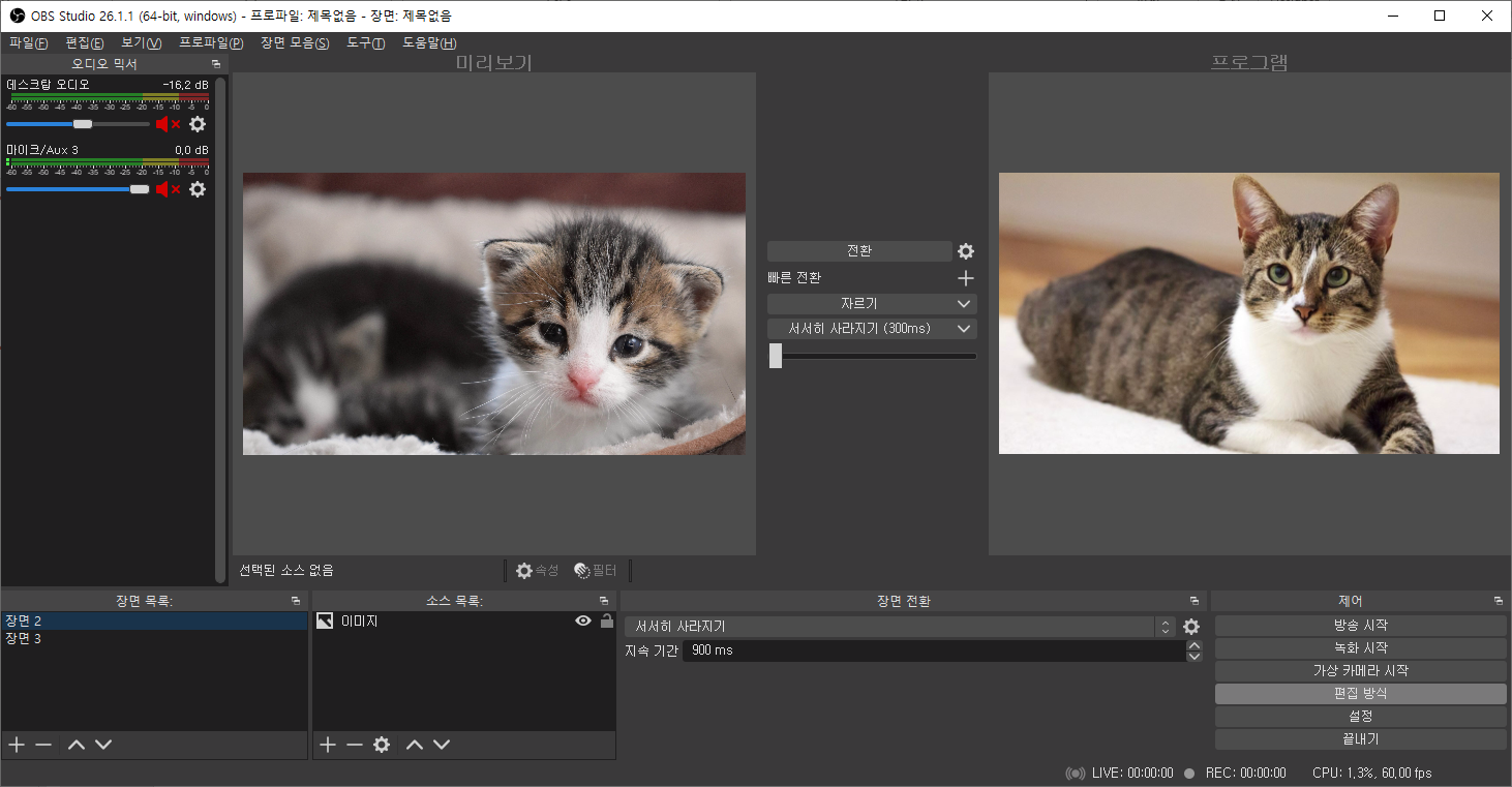 우선 여러분들이 실제 방송이나 중계 시 사용하는 소스와 장면들을 평소와 같이 준비하도록 합니다.