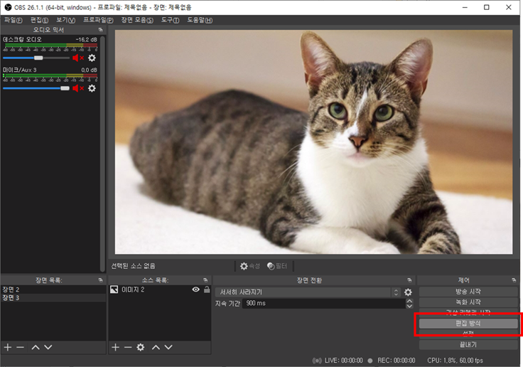 OBS 우측 하단에 위치한 편집 방식이라는 버튼을 눌러주면 준비가 끝납니다.