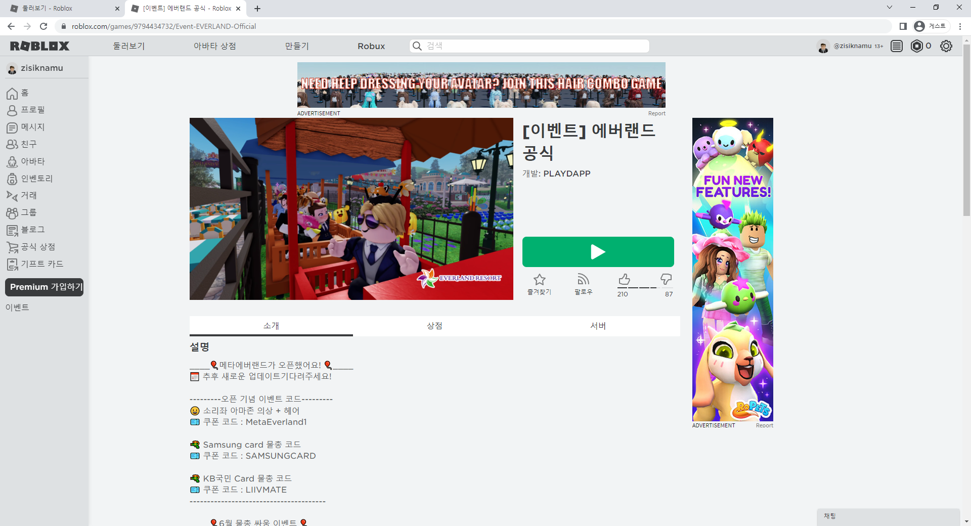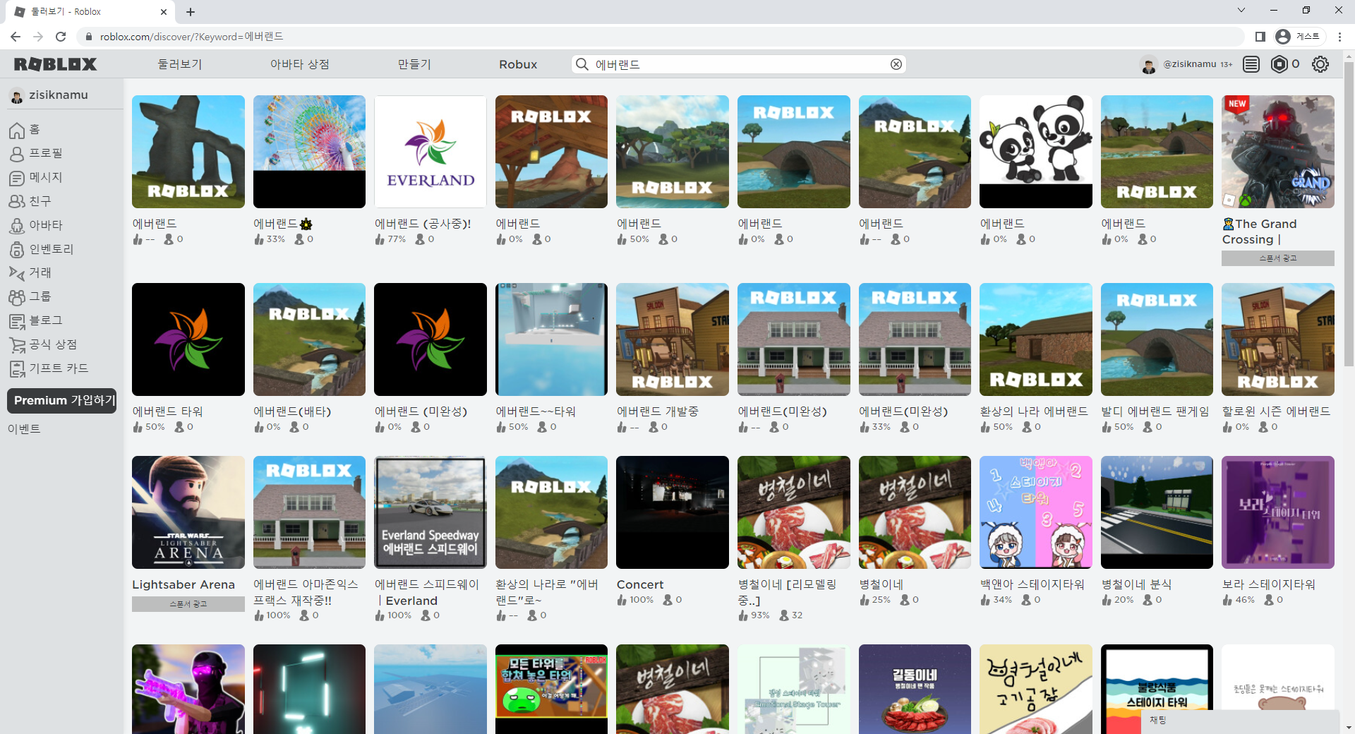 해서 공식 계정이 열렸다는 기사를 보고 로블록스에서 '에버랜드'를 검색했으나..... 터무니없이 많은 가짜 체험들만 왕창 있더군요.